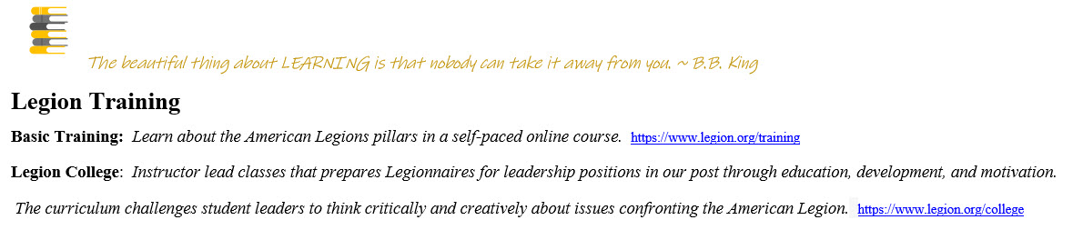 Historian: Attends post functions and documents the event with narrative and photos. Compiles and records post records.